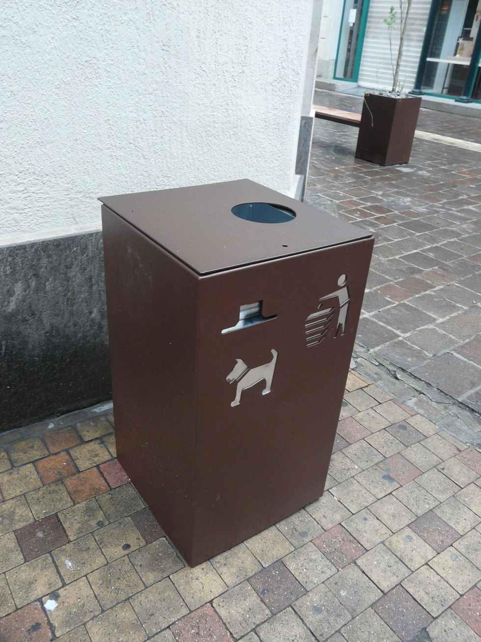 Pictogrammes corbeille et chien découpés au laser.